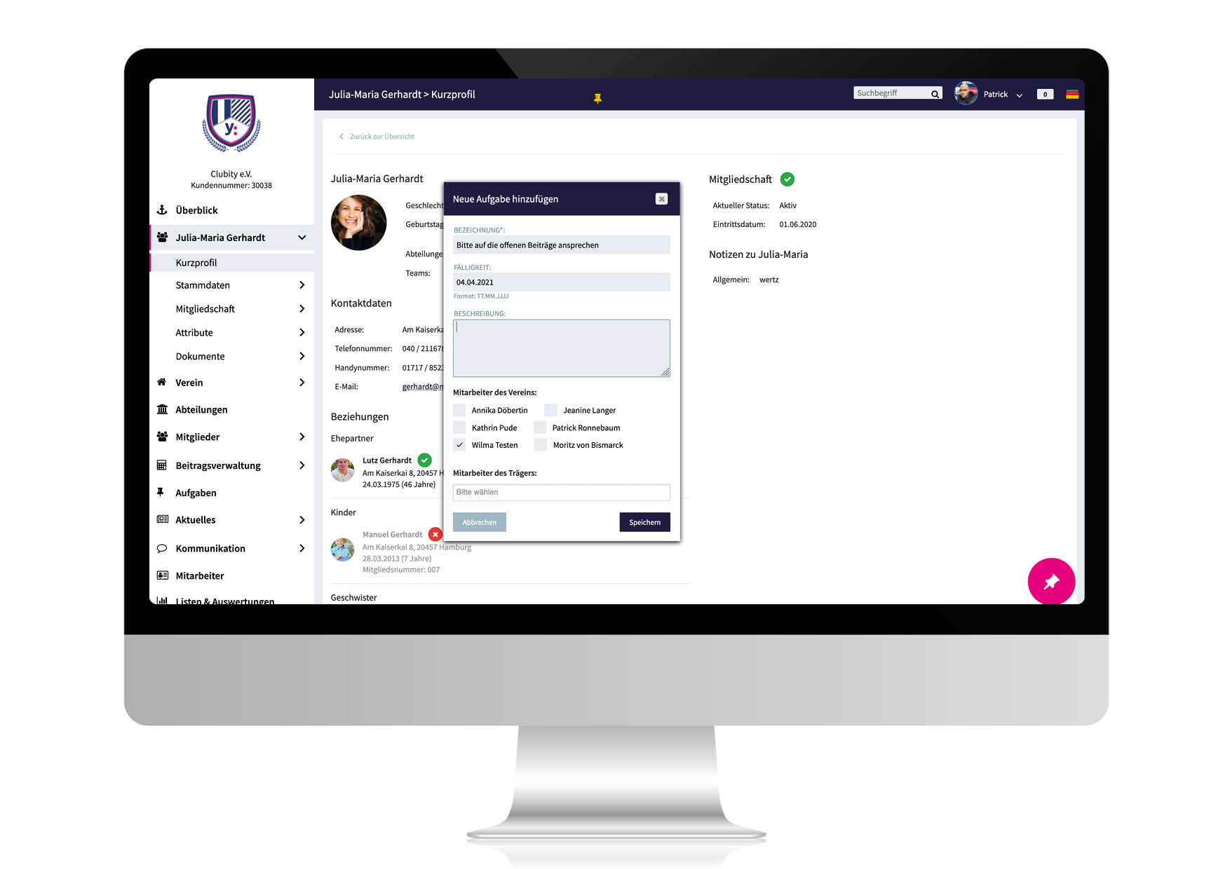 • Mit Pin-Nadeln Aufgaben direkt in bestimmte Bereiche „pinnen“, wie z.B. an bestimmten Datenfeldern von Mitgliedern oder Mitarbeitenden